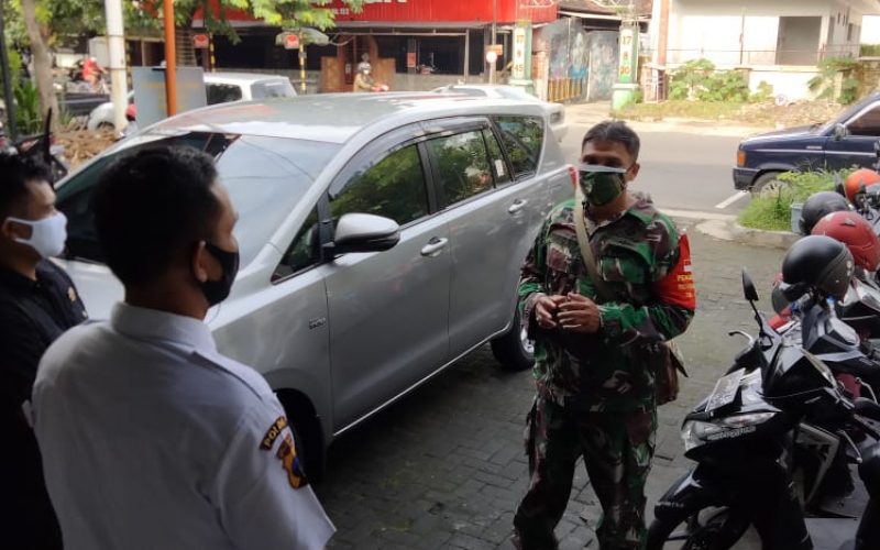 Babinsa Kelurahan Kratonan Koramil 03 Serengan Kodim 0735 Surakarta Sersan Mayor Yudhi Widianto melaksanakan pengecekan Penerapan Edukasi  Pembatasan Pemberlakuan Kegiatan Masyarakat (PPKM) di Bank Shinhan dan Els Komputer.