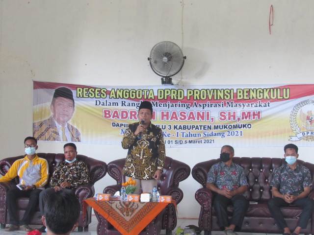 MUKOMUKO – Anggota Dewan Perwakilan Rakyat Daerah (DPRD) Provinsi Bengkulu mengadakan kegiatan di luar gedung pertama di tahun 2021, untuk secara langsung menjaring aspirasi masyarakat. Seperti halnya yang dilakukan oleh H. Badrun Hasani, SH, MH yang mengadakan reses pada 5 desa yakni Desa Rami Mulia, Desa Talang Rio, Desa Air Buluh, Desa Talang Arah dan Desa Air Merah. Kelima desa tersebut berada di 3 kecamatan yang berbeda di Kabupaten Mukomuko. Reses digelar di Balai Pertemuan Desa.