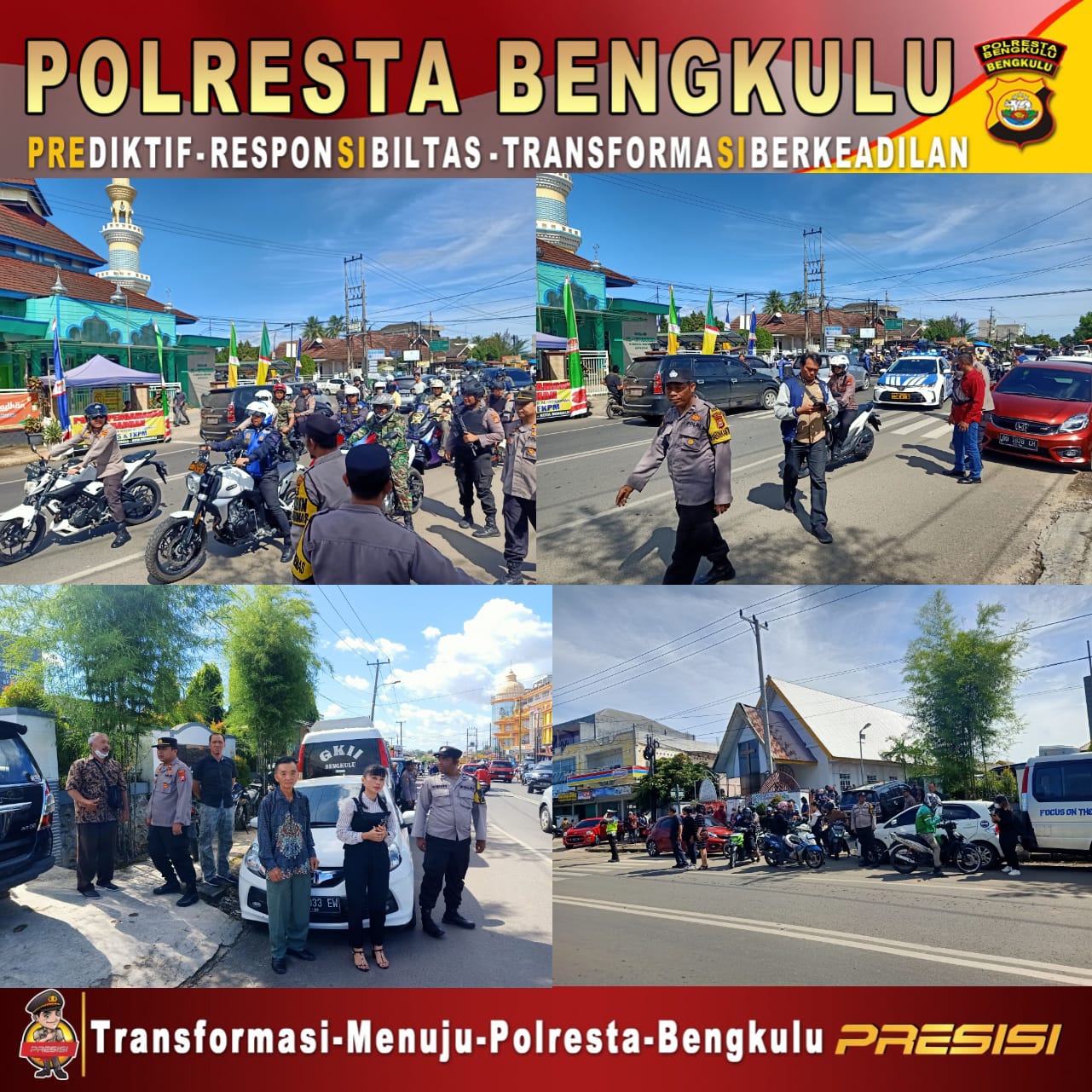 Bengkulu – Polsek Ratu Agung Polresta Bengkulu Polda Bengkulu melakukan pengaman kegiatan ibadah Jumat Agung di Gereja Kristen Injil Indonesia (GKII) Jalan Merapi No 19 Kebun Tebeng Kecamatan Ratu Agug Kota Bengkulu, Jumat (07/04/2023).