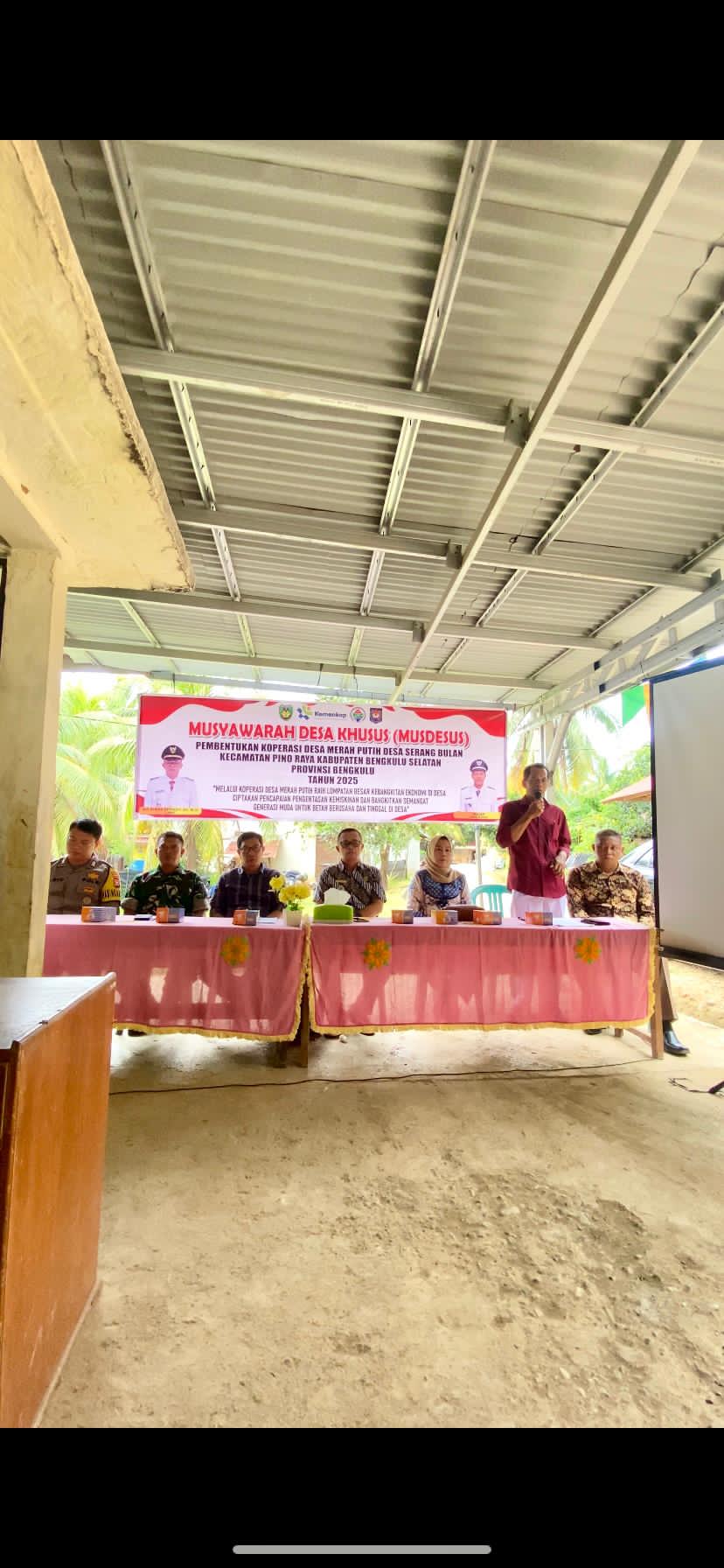 Polres Bengkulu Selatan melalui Bhabinkamtibmas Polsek Pino Raya, Brigpol Hendrik Rio, menghadiri Musyawarah Desa Khusus (Musdesus) Pembentukan Koperasi Desa Merah Putih di Desa Serang Bulan, Kecamatan Pino Raya, Kabupaten Bengkulu Selatan, pada Kamis, 8 Mei 2025.