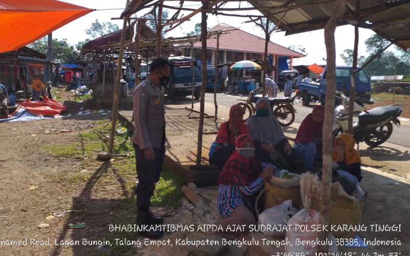 Menjalankan tugas menyampaikan himbauan, AIPDA Ajat Sudrajat yang bertugas sebagai Anggota Bhabinkamtibmas Polsek Karang Tinggi, Senin (07/06/2021) menggelar kegiatan sambang di Pasar Pekan Mingguan Desa Taba Lagan Kecamatan Semidang Lagan Kabupaten Bengkulu Tengah.