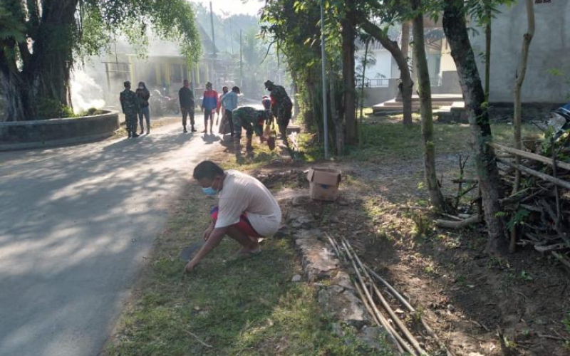 Namun pagi ini Peltu Agung Widagdo selaku tertua dalam pengambil apel, berinisiatif mengajak anggota satgas Pra TMMD bersama masyarakat untuk sejenak membersihkan lingkungan disekitar kantor Balai Desa dan jalan sekitar, Senin (07/06/2021).
