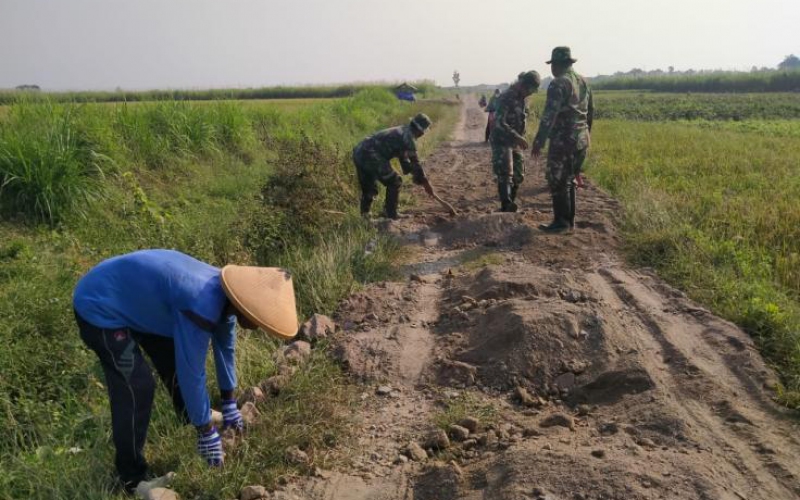 Sebagian dari anggota TNI Kodim 0718/Pati, satgas Pra TMMD menggunakan cangkul untuk menarik tanah kedepan, kanan dan kiri, sehingga tanah menjadi rata.