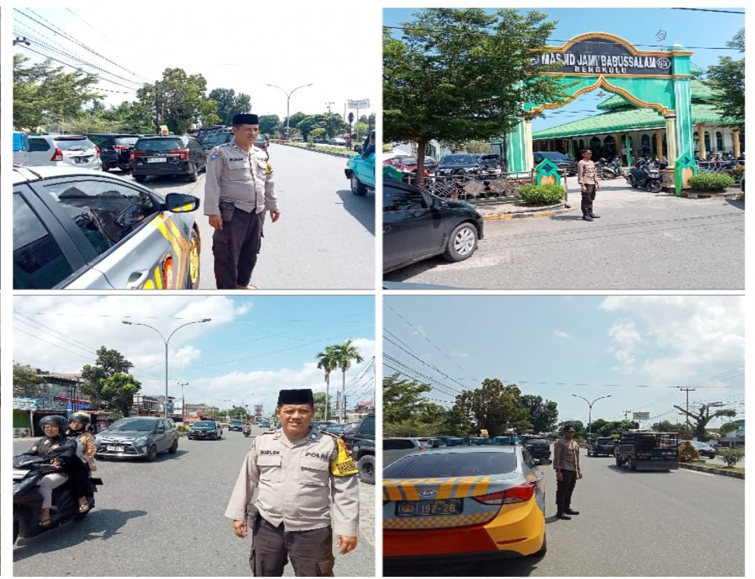 Bengkulu – Jemaah Salat Jumat di Jamik Babusallam KM 8 jalan P Natadireja kelurahan Jalan Gedang Kota Bengkulu bisa tenang menunaikan ibadahnya, sebab, dari Polsek Gading Cempaka melakukan penjagaan disekitar masjid, saat jemaah menunaikan Salat Jumat.