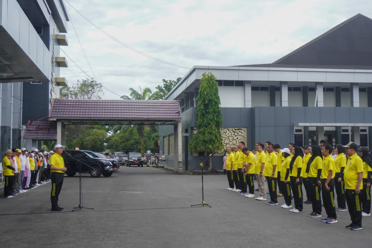 Pimpin apel sekaligus melepas kontingen Provinsi Bengkulu pada PORNAS XVI KORPRI tahun 2023 di Semarang, Gubernur Bengkulu Rohidin Merysah berikan dukungan dan semangat, Jumat (7/7/2023).