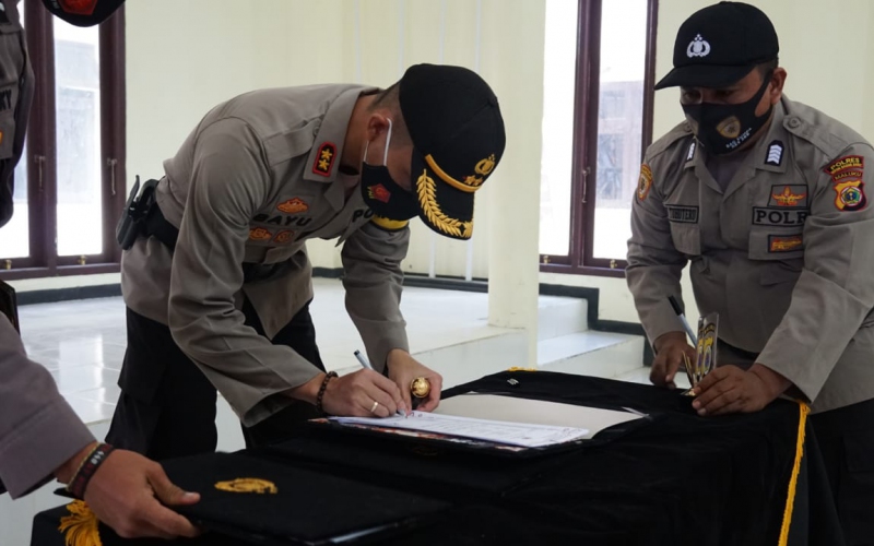 Kapolres Seram Bagian Barat, AKBP Bayu Tarida Butar Butar pimpin serah terima jabatan (Sertijab) tiga perwira dilingkup Polres Seram Bagian Barat, yang bertempat di Aula Bhayangkara Polres SBB, Senin (7/12/2020).
