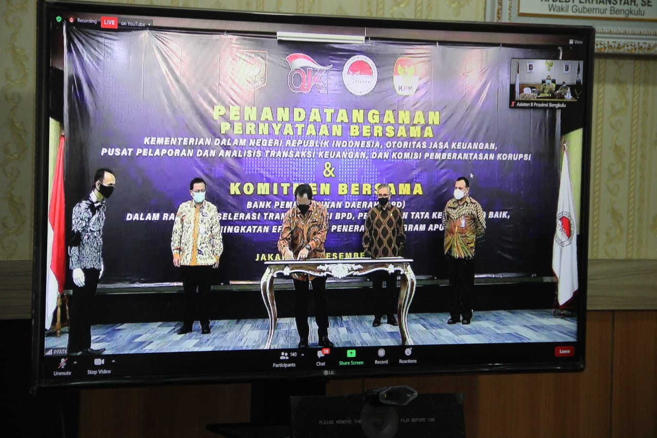 Bengkulu, Siberindo.co – Asisten II Setda Provinsi Bengkulu Yuliswani menyaksikan Penandatanganan Pernyataan Bersama Penguatan Bank Pembangunan Daerah (BPD) dan Penandatanganan Komitmem BPD Tentang Akselerasi Transformasi BPD via Virtual Meeting, di Ruang VIP Pola Provinsi Bengkulu, Selasa (08/12/2020).