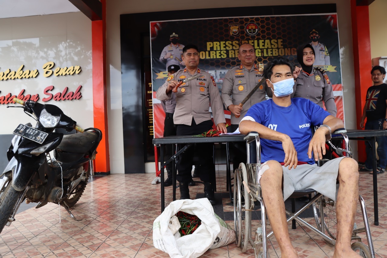 “Petugas yang sedang berpatroli kemudian mendatangi TKP dan mengamankan terduga pelaku bersama barang bukti sekitar 10 Kg cabai rawit dan cabai merah seitar 5 Kg, serta sebilah senjata tajam milik terduga pelaku,” terang Kapolres Rejang Lebong Polda Bengkulu AKBP Tonny Kurniawan, saat press release di Mapolres, Senin (9/1/2023).