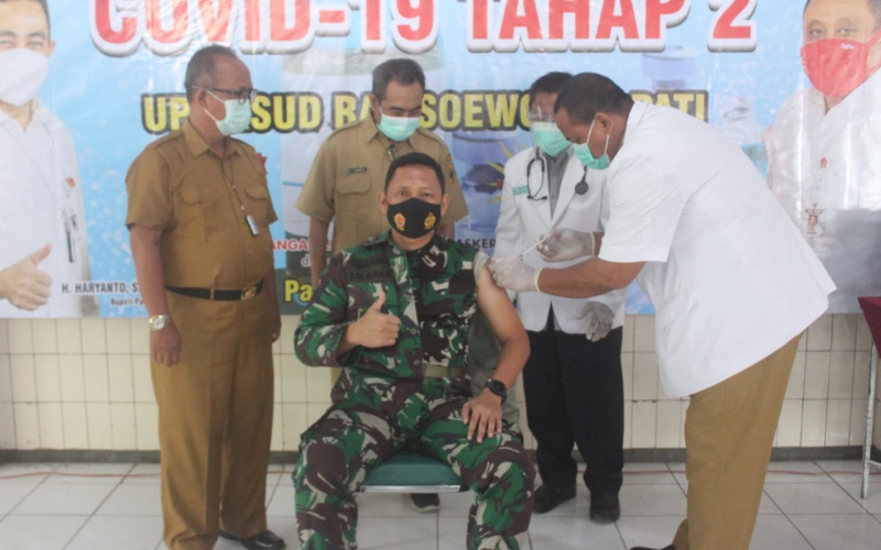 Forkopimda, tokoh agama dan tokoh masyarakat yang menerima suntikan vaksin diantaranya adalah Bupati Pati H. Haryanto, SH, M.M, M.Si, Dandim 0718 Pati Letkol Czi Adi Ilham Zamani, SE, M.I.Pol, Kapolres Pati Akbp Arie Prasetya Syafa’at, S.I.K, Kepala Dishubkominfo Kab Pati Raden Adi Prastanto, Sekda Kab. Pati Ir. Suhariyono, MM dan Ketua PCNU Kab.Pati KH. Yusup Hasim.(Snpt/Pendim)