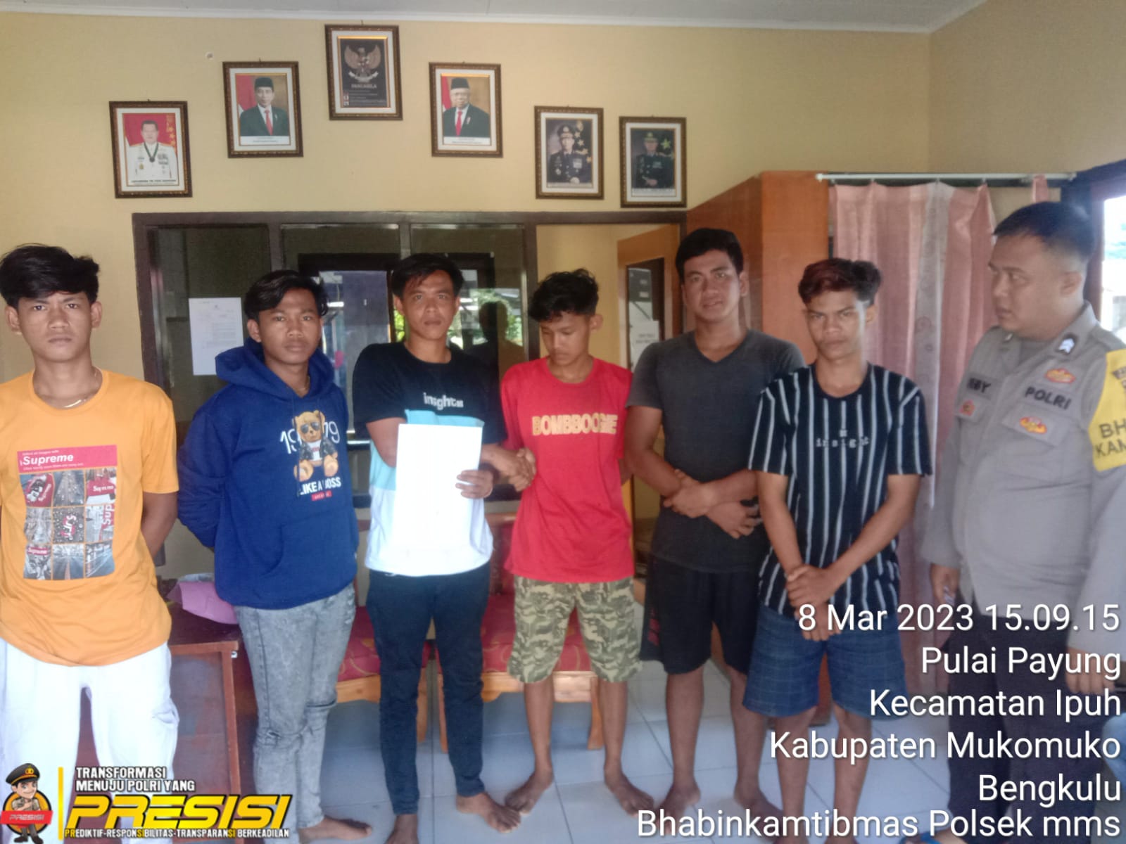 Kapolsek Mukomuko Selatan Iptu Firman Syahputra,S.H,M.H, didampingi Bhabinkamtibmas Briptu Febi Agus kemudian mempertemukan kedua belah pihak yang bermasalah, dengan didampingi oleh orang tuanya masing-masing untuk menyelesaikan masalah tersebut.
