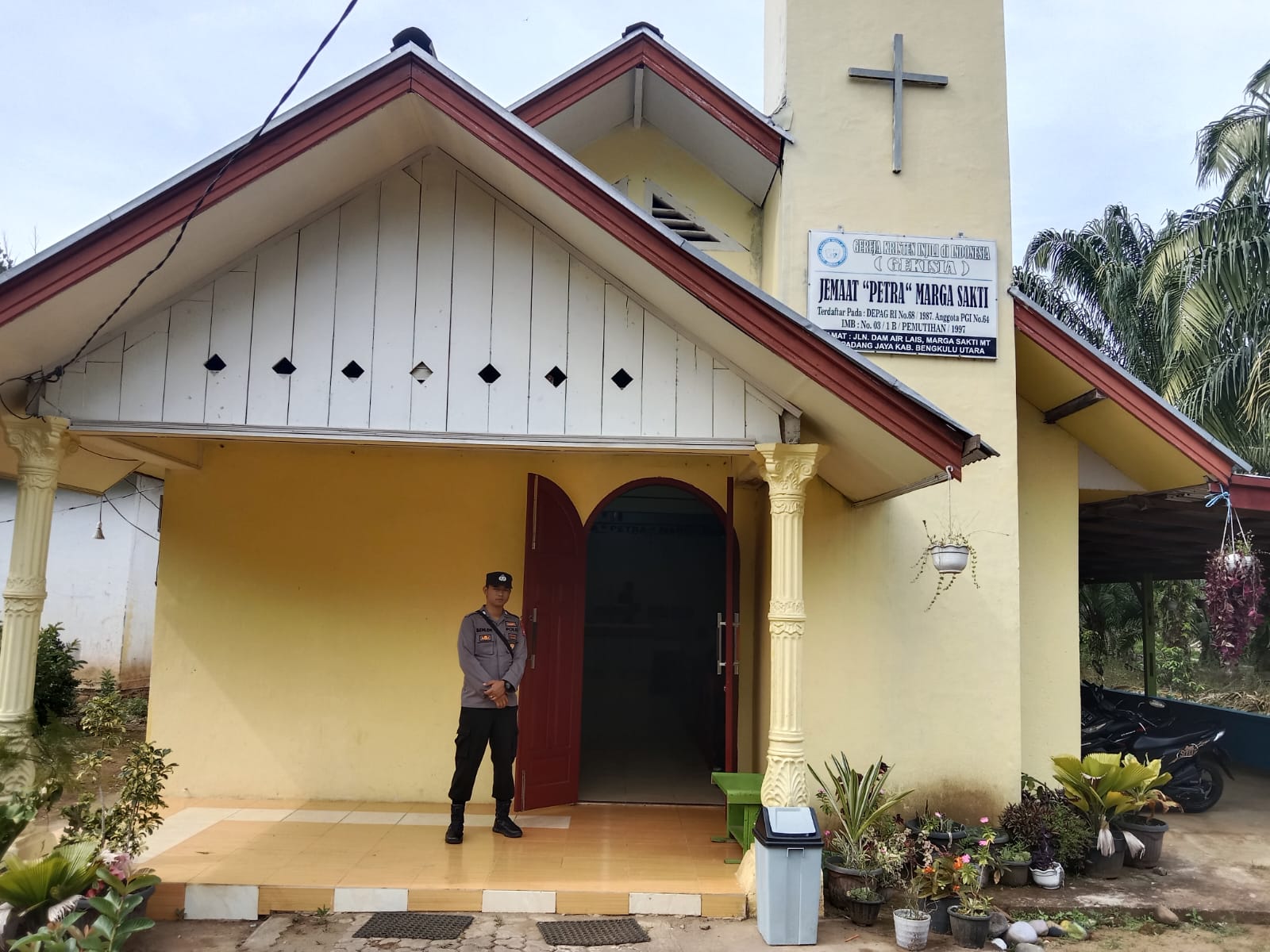 Personel Polsek Polsek Padang Jaya Polres Bengkulu Utara Polda Bengkulu diterjunkan melakukan pengamanan terbuka maupun tertutup di sejumlah Gereja maupun Rumah Doa.