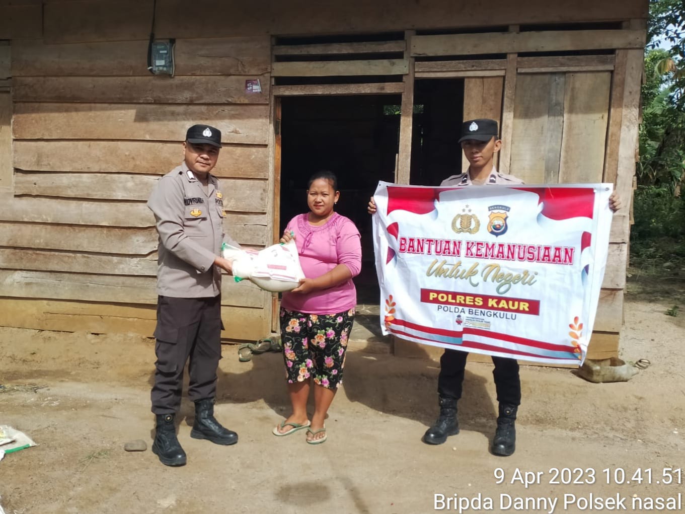 Kaur – Polsek Nasal, Polres Kaur Polda Bengkulu kembali menyalurkan bantuan sosial kepada warga kurang mampu dan atau yang membutuhkan, Minggu (9/4/2023).