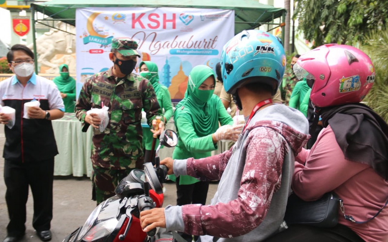Ngabuburit bareng Rumah Sakit Keluarga Sehat Pati, Kodim 0718/Pati dan Persit Kartika Chandra Kirana cabang XXXIX Kodim Pati berbagi takjil kepada pengguna jalan.