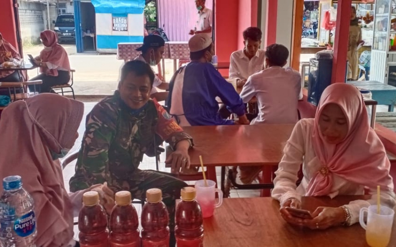 Babinsa Koramil 01/Jungkat, Sertu Alexsander melaksanakan komunikasi sosial (komsos) dengan Pedagang dan pengunjung Pasar Segedong, Kabupaten Mempawah, Sabtu (5/6/2021)