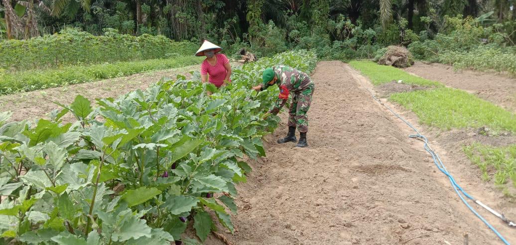 Babinsa Koramil 1014-05/P.Banteng Kodim 1014/Pbn Serda Ari melaksanakan komunikasi sosial dan pendampingan dengan membantu petani membersihkan gulma pada tanaman Terong milik Ibu Yatmo di lahan 36 × 50 di Desa Karang Sari Kecamatan Pangkalan Banteng, Rabu (09/06/2021).