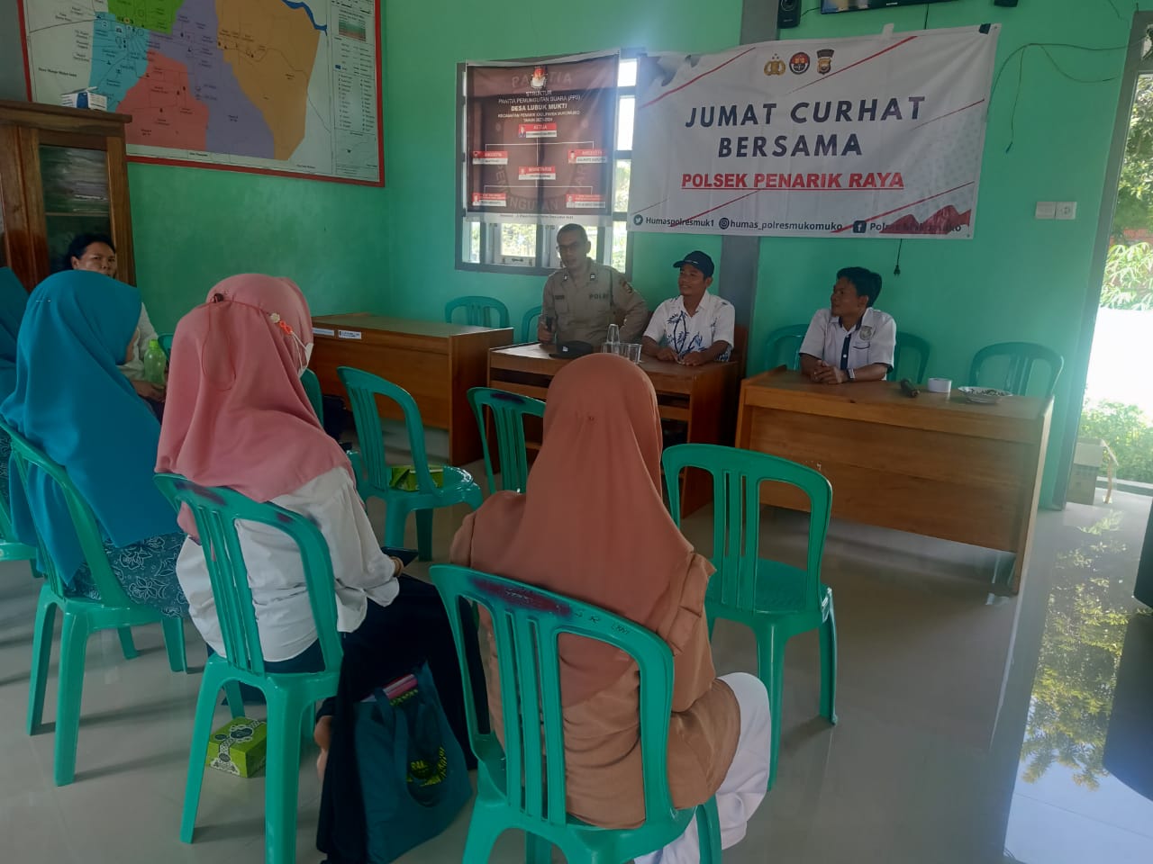 Kegiatan Jumat Curhat yang ditujukan kepada warga Desa Lubuk Mukti oleh Kapolsek Penarik Raya dan Personel Polsek Penarik Raya, bertujuan untuk saling mengingatkan warga yang sedang beraktivitas di Desa Lubuk Mukti.