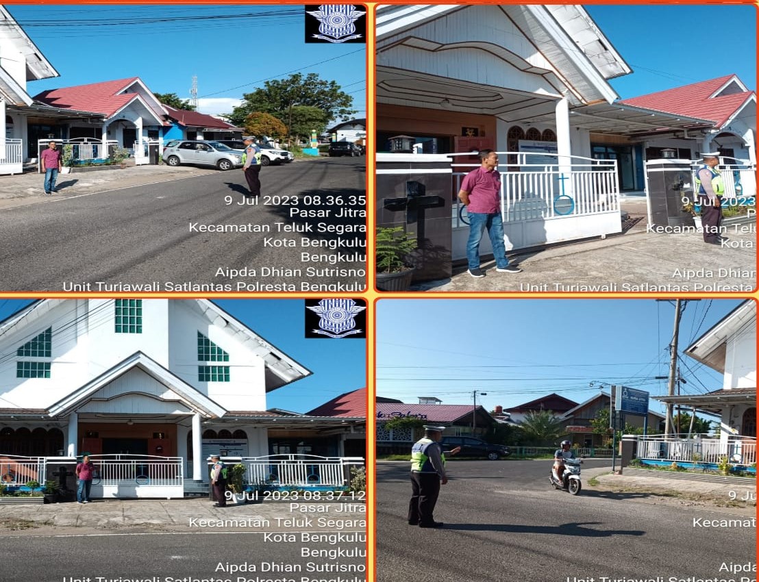 Bengkulu – Personel Sat Lantas Polresta Bengkulu Polda Bengkulu melaksanakan kegiatan Pam Turlalin Ibadah Misa di Gereja St Yohanes Penginjil Bengkulu di Jalan Prof. Dr Hazairin SH, Minggu (09/07/2023).
