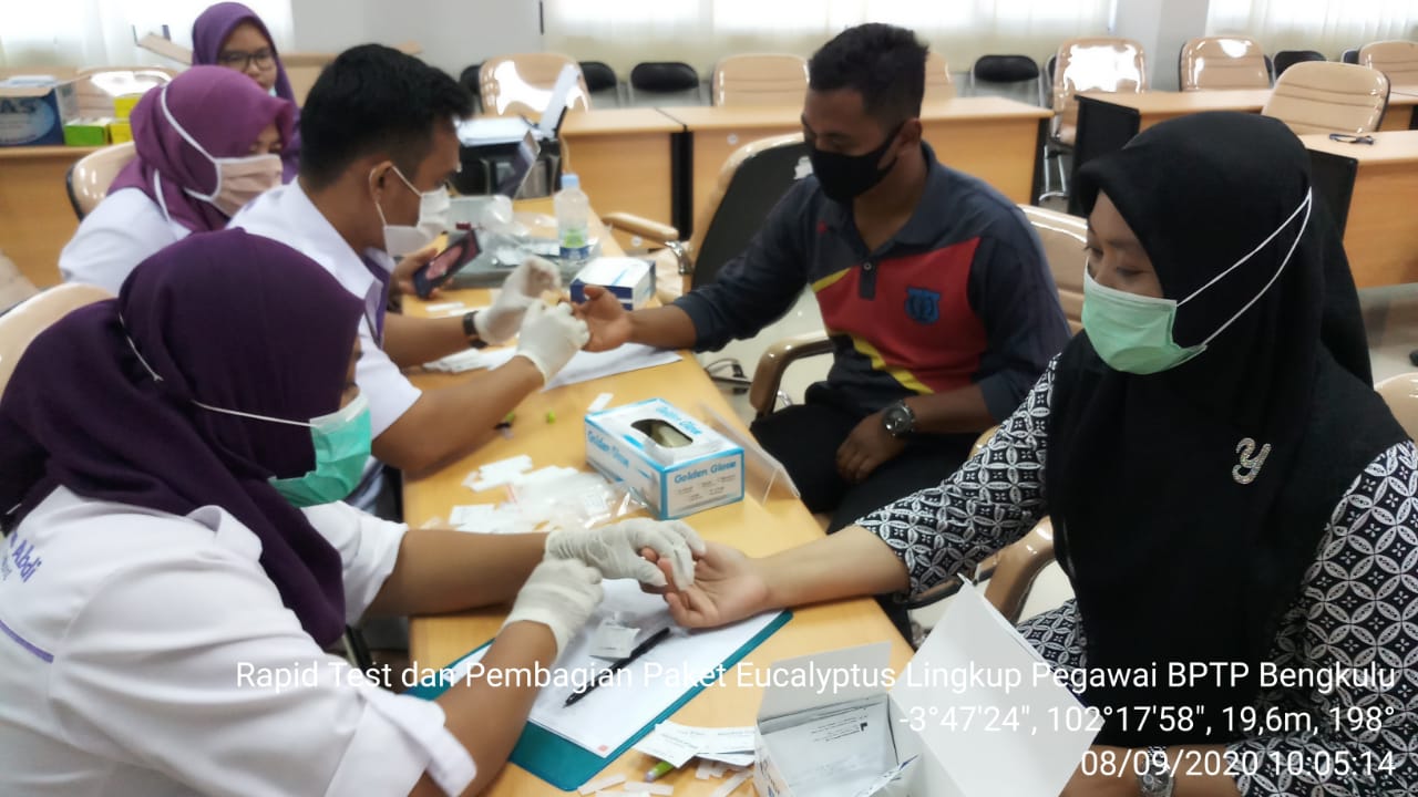 Bengkulu, Siberindo.co – Sebanyak 103 pegawai ASN dan outsourcing BPTP Balitbangtang Bengkulu lakukan Rapid Test pada Selasa (08/09/2020). Hal ini dilakukan untuk antisipasi paparan Covid-19 pada pegawai di lingkup Kementerian Pertanian karena semakin meningkatnya kasus positif Covid-19 di Indonesia dan khususnya di Bengkulu.