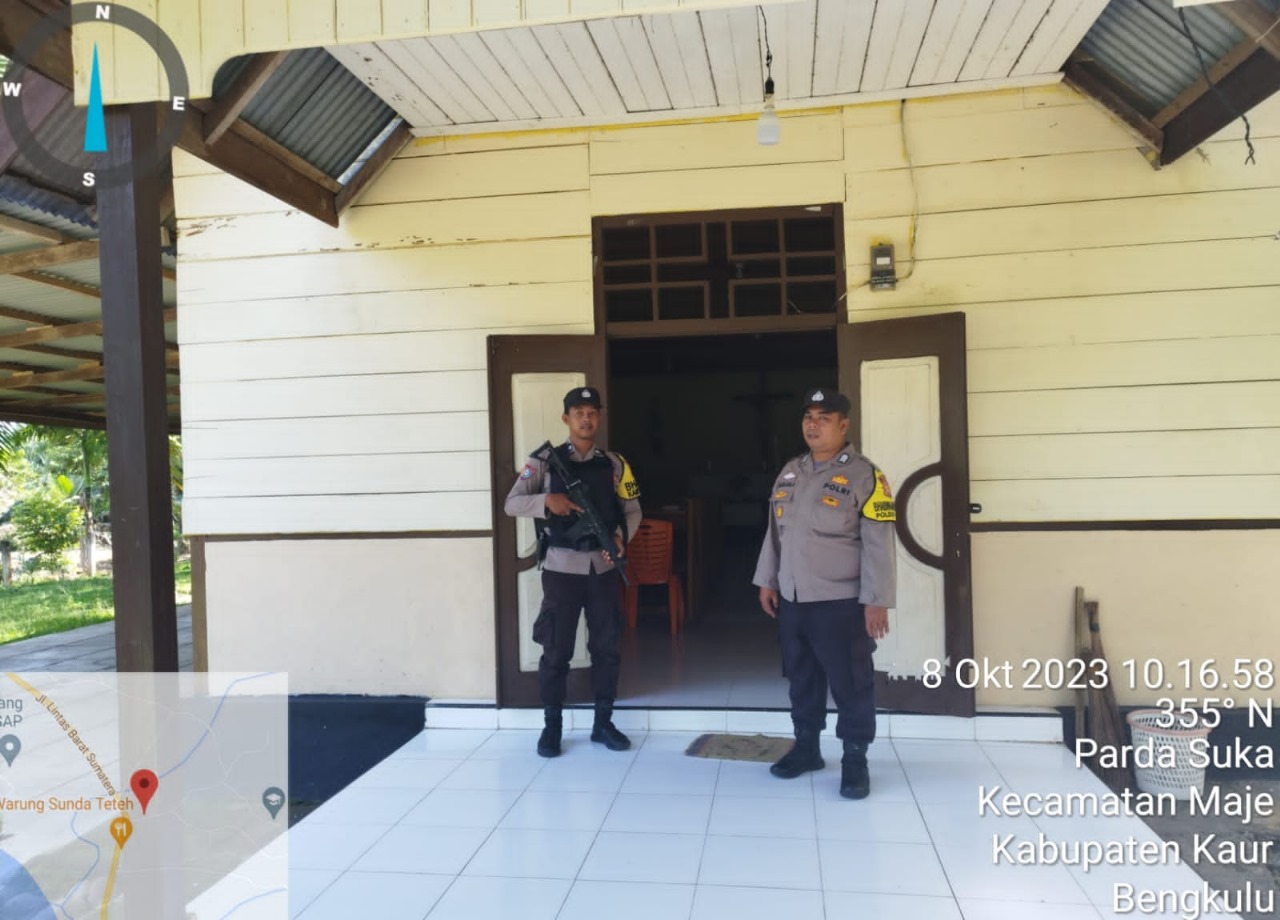 Kaur – Polsek Maje Polres Kaur Polda Bengkulu, melaksanakan Pengamanan Gereja di Wilayah hukum Polsek Maje Kecamatan Maje Kabuapten Kaur, Minggu, (08/10/2023) Pukul 10.00 WIB s/d Selesai.