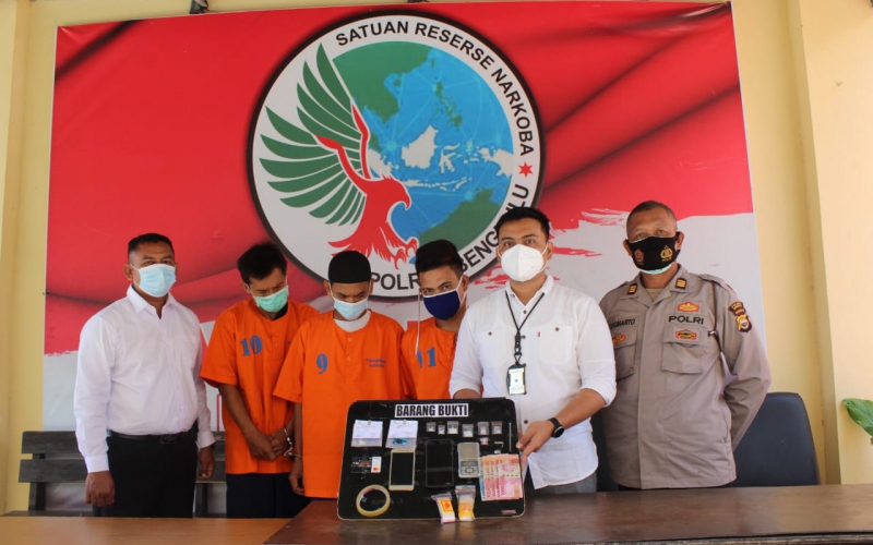 Dalam kesempatan ini, Kasubbaghumas Polres Bengkulu AKP Sugiharto bersama Kasat Narkoba IPTU Sampson Sosa Hutapea, S.IK, dan KBO IPDA Bekti Sutikno, menerangkan pihaknya berhasil mengamankan 3 orang pria sebagai terduga pelaku dengan tempat dan waktu yang berbeda.