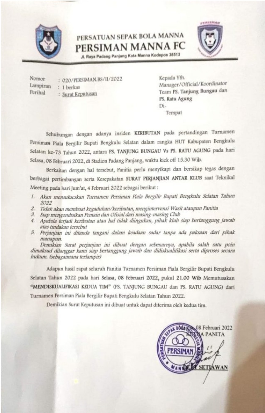 “Sesuai dengan surat perjanjian antar klub saat teknikal meeting hari Jumat 04 Februari kemarin dan hasil rapat seluruh panitia turnamen Persiman piala bergilir Bupati Bengkulu Selatan tahun 2022 pada hari Selasa kami memutuskan mediskualifikasi kedua tim tersebut dari turnamen Persiman piala bergilir Bupati Bengkulu Selatan tahun 2022,” ungkap Ketua pelaksana turnamen Persiman Bupati Cup Bengkulu Selatan.