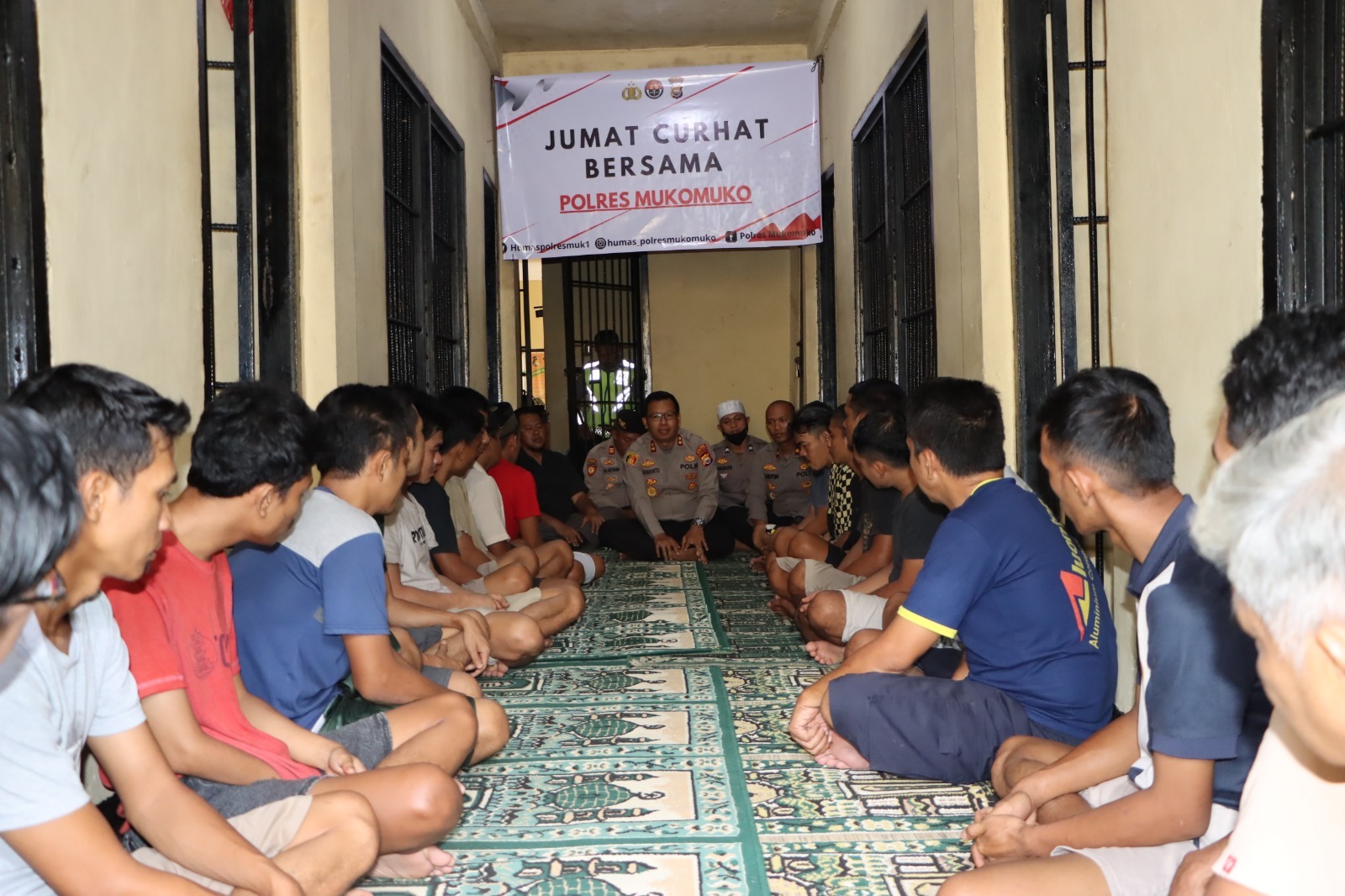 Mukomuko – Program Jumat Curhat yang rutin dilaksanakan setiap Jumat Oleh Polres Mukomuko terus dilakukan. Tidak hanya kepada masyarakat, tetapi Warga Binaan yang ad di dalam Polres Mukomuko pun ikut di ajak “curhat” oleh Kapolres Mukomuko AKBP Nuswanto, S. H., S. IK., M. H., pada Jumat pagi (10/2/2023).