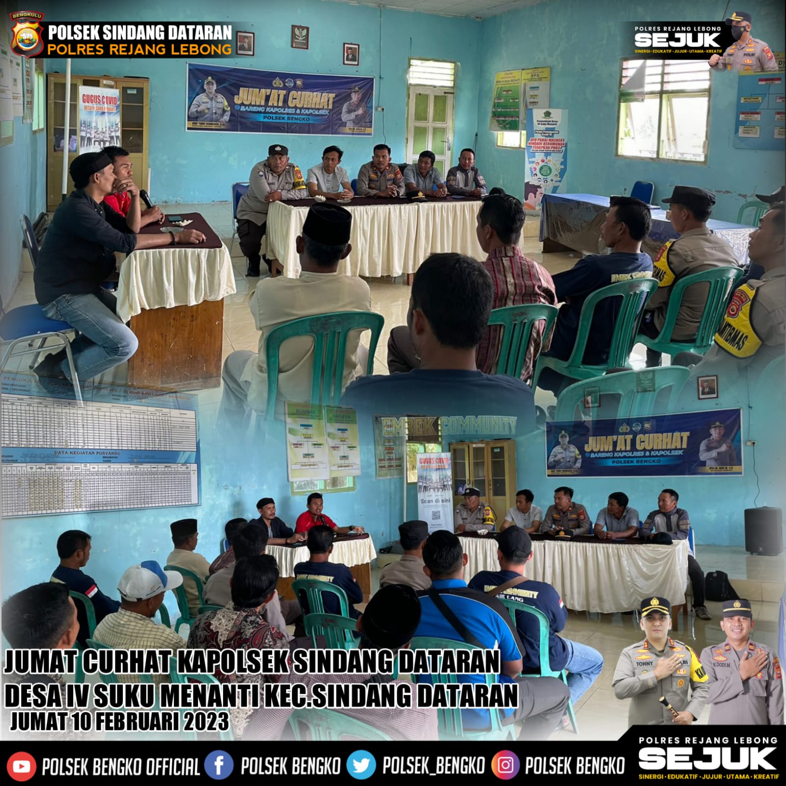 Bengkulu, Siberindo.co – Polsek Sindang Dataran Polres Rejang Lebong Polda Bengkulu, mengadakan kegiatan Jumat Curhat di Desa IV Suku Menanti Kecamatan Sindang Dataran Kabupaten Rejang Lebong, Jumat (10/2/2023).