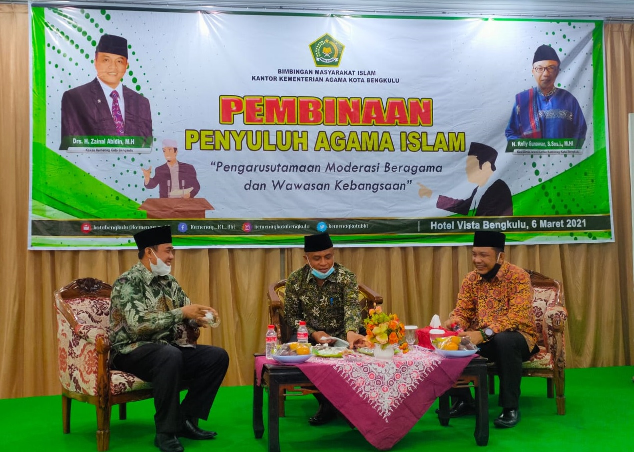 Kepala Kantor Kemenag Kota Bengkulu, Drs H Zainal Abidin M.H, dalam sambutannya saat membuka acara secara resmi menyampaikan bahwa pembinaan ini memberikan pemahaman dan ilmu kepada penyuluh dalam menghadapi arus moderasi beragama yang sangat cepat terjadi.