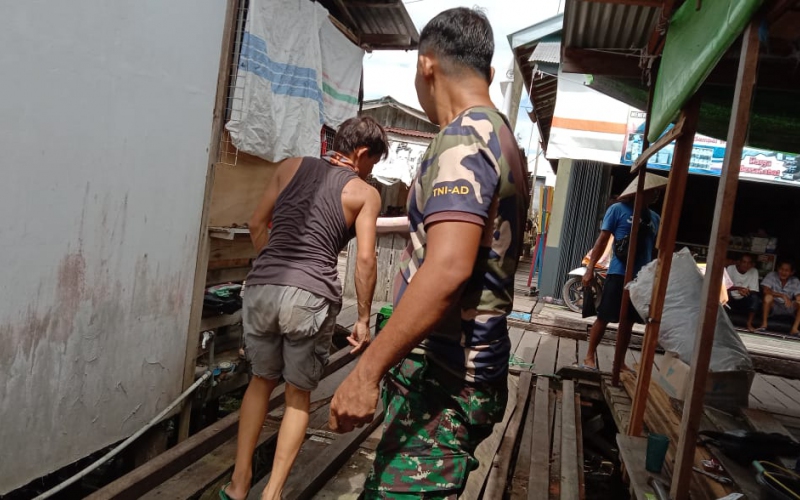 Babinsa Koramil 1206-09/Jongkong Koptu Umar bersama masyarakat melaksanakan kegiatan perbaikan jembatan kayu yang sudah rusak di Desa Jongkong Kecamatan Jongkong, Kabupaten Kapuas Hulu, Rabu (09/06/21)