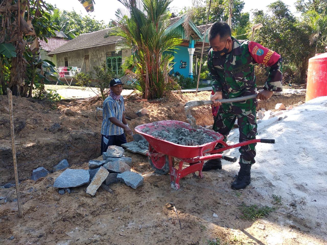 Bintara Pembina Desa (Babinsa) Koramil 1014-05/P.Banteng,Kodim 1014/Pbn Serda Muheini, bersama masyarakat gotong royong membuat saluran air (parit) di Desa Sungai Rangit Jaya, Kecamatan pangkalan Banteng, Kamis(10/06/2021).