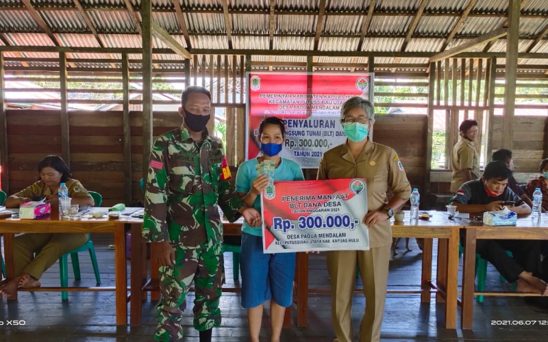 Babinsa Ariung Mendalam Praka Dedik Sulistiyo Anggota TNI dari Koramil 06/Putussibau Utara Kodim 1206/PSB membantu menyalurkan Bantuan Langsung Tunai (BLT) Dana Desa di wilayah binaanya Desa Ariung Mendalam, Kecamatan Putussibau Utara, Selasa (08/06/2021).