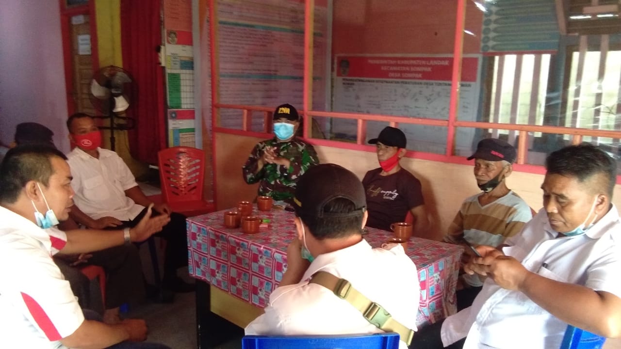 Landak- Babinsa Koramil 1201-07/Mempawah Hulu, Serda Simon melaksanakan komunikasi sosial (komsos) dengan perangkat Desa Sompak, Ketua BPD, Ketua DAD Kecamatan Sompak, Kabupaten Landak, Rabu (9/6/2021)