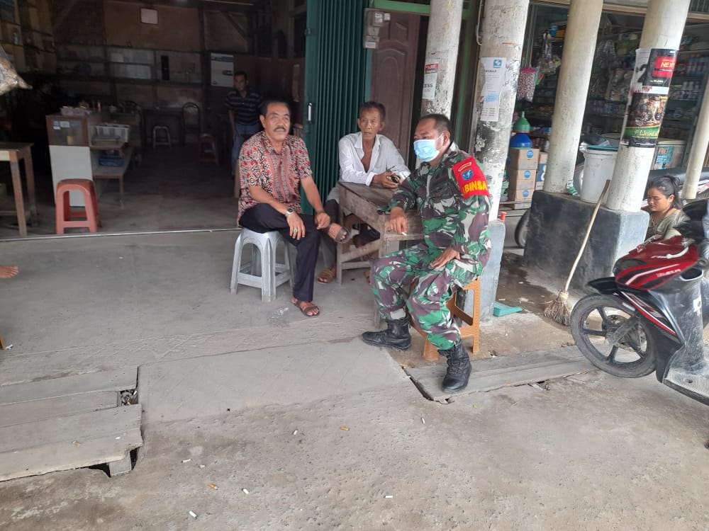 Mempawah – Bala Pembina Desa (Babinsa) Koramil 1201-04/Sungai Kunyit, Serda Burhan, melaksanakan komunikasi sosial (Komsos) secara berkeliling warga dan pedagang pasar di Desa Sungai Kunyit Laut, Kecamatan Sungai Kunyit, Kabupaten Mempawah, Rabu (9/6/2021).