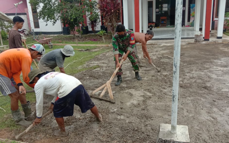 Babinsa Koramil 12/Air Besar, Serda Masnar bersama masyarakat bergotong royong mengecor halaman Kantor Camat setempat yang mulai dioperasikan, Senin (7/6/2021).