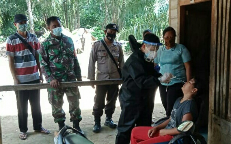 Babinsa Koramil 1201-09/Sengah Temila bersama nakes Puskesmas Pahauman kembali turun melakukan pelacakan kontak di Dusun Raden Desa Paloan. Sebanyak satu keluarga ditracing untuk identifikasi kasus baru Covid 19 di wilayah Kecamatan Sengah Temila, Selasa (8/6/2021).