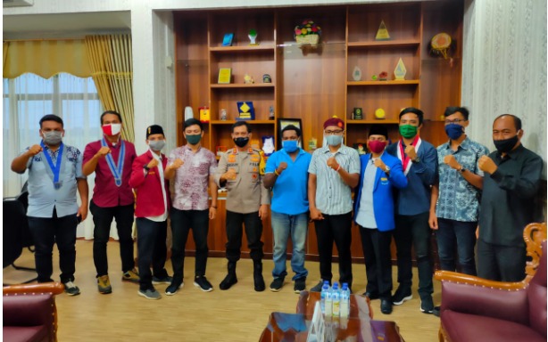 Bengkulu – Sejumlah pengurus organisasi kemahasiswaan di Bengkulu bertemu dengan Kapolda Bengkulu Irjen Pol Drs Teguh Sarwono M.Si di ruang tamu Kapolda Bengkulu, Rabu (8/7/2020). Organisasi kemahasiswaan tersebut yakni IMM, PMII, PMKRI, GMNI, GMKI dan Imapa.