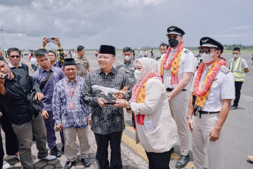 Bengkulu, Siberindo.co – Pesawat Super Air Jet dengan kapasitas penumpang 180 kursi kelas ekonomi telah resmi mengudara di langit Bengkulu. Kedatangan crew pesawat Super Air Jet dengan nomor penerbangan Airbus A320-200 ini disambut oleh Gubernur Bengkulu Rohidin Mersyah, bersama jajaran, Jumat (9/9/2022) siang.