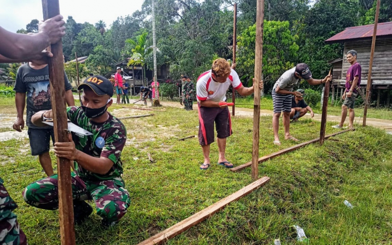 Satgas Pamtas RI-Malaysia Yonif 407/PK bersama masyarakat melaksanakan karya bakti Pembuatan pagar di Balai Desa Jasa, Dusun Wakampuh, Desa Jasa, Kecamatan Ketungau Hulu, Kabupaten Sintang, Kalbar.