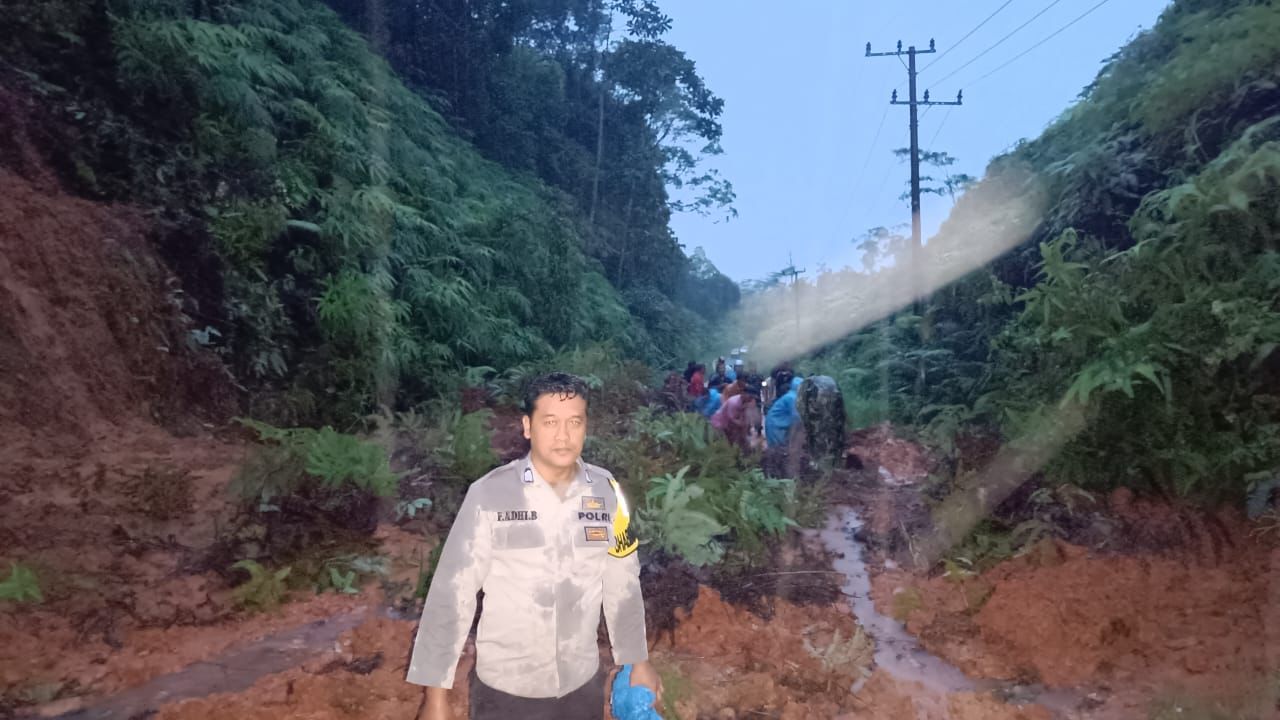 Lebong – Personel Piket Polsek Lebong Atas Polres Lebong Polda Bengkulu, melaksanakan pengecekan tanah longsor di Bukit Resam Padang Bano, Sabtu (11/3/2023) sore.