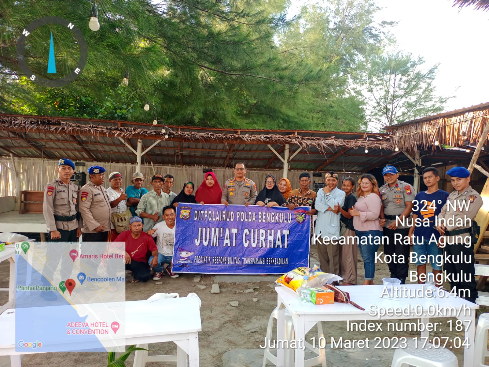 Bengkulu – Wadirpolairud Polda Bengkulu AKBP Andi Dady Nurcahyo, S.I.K., menggelar Jumat Curhat di Bravo Kafe Wisata Pantai Panjang Kota Bengkulu, Jumat (10/3/2023) siang.