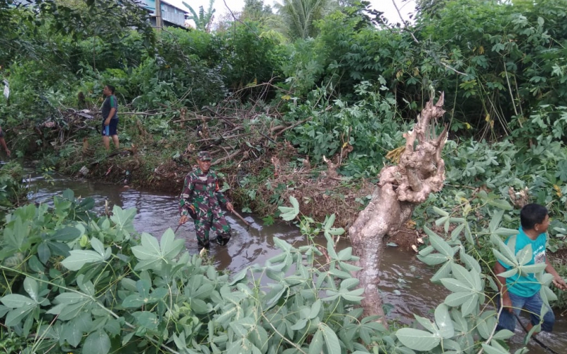 Selanjutnya Serda Edi Winarso melaksanakan gotong royong untuk memperlancar aliran air agar tidak terjadi Banjir pada saat hujan tiba, selain itu ini juga bertujuan menciptakan lingkungan yang bersih dan sehat, “jelasnya.