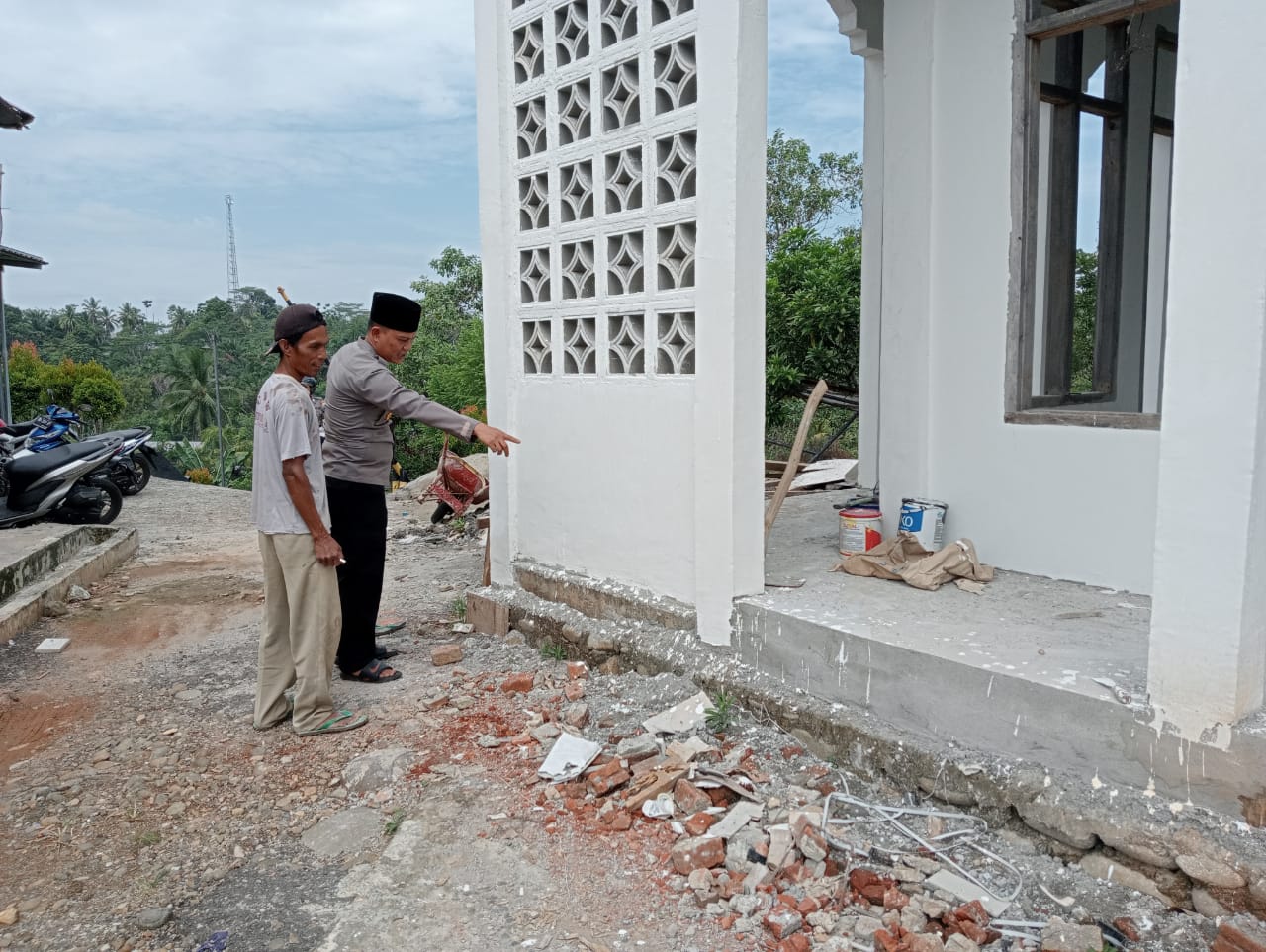 Bengkulu Utara – Kapolsek Batiknau Polres Bengkulu Utara Polda Bengkulu, Ipda Deni Mashuri, S.H., didampingi Kepala tukang Sardi memeriksa Bangunan Mushola yang dibangun oleh para personel Polsek Batiknau Sabtu (10/06/2023).