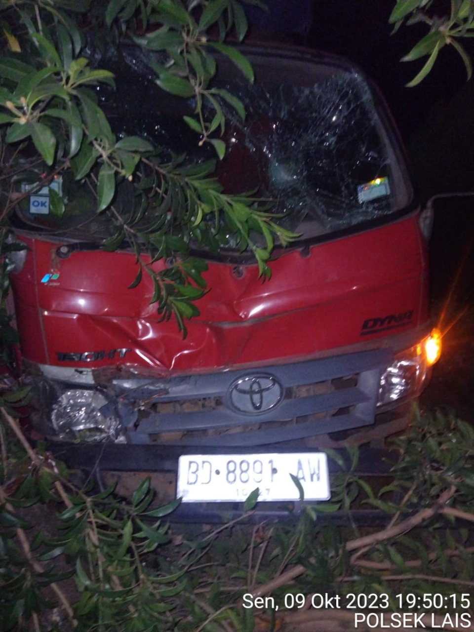 Personel polsek Lais Polres Bengkulu Utara Polda Bengkulu, yang saat itu mendapat informasi dari warga tentang adanya kejadian ini langsung meluncur ke tempat kejadian kecelakaan tunggal ini, dan sesampainya di lokasi, bersama-sama dengan warga langsung membantu untuk evakuasi truk Toyota Dyna berwarna merah dengan Nomor Polisi BD 8891 AW, dengan muatan batu bara tersebut.