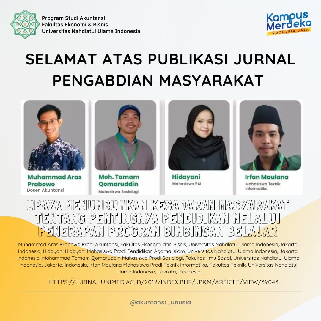 Jurnal tersebut terbit pada Jurnal Pengabdian Kepada Masyarakat (JPKM) Universitas Negeri Medan (Unimed) bereputasi nasional dengan akreditasi SINTA 3. Jurnal tersebut ditulis oleh Dosen Akuntansi Unusia Muhammad Aras Prabowo bersama mahasiswa lintas Prodi di Unusia yaitu Hidayani Hidayani Mahasiswa Prodi Pendidikan Agama Islam, Mohammad Tamam Qomaruddin Mahasiswa Prodi Sosiologi, Fakultas Ilmu Sosial, Irfan Maulana Mahasiswa Prodi Teknik Informatika.