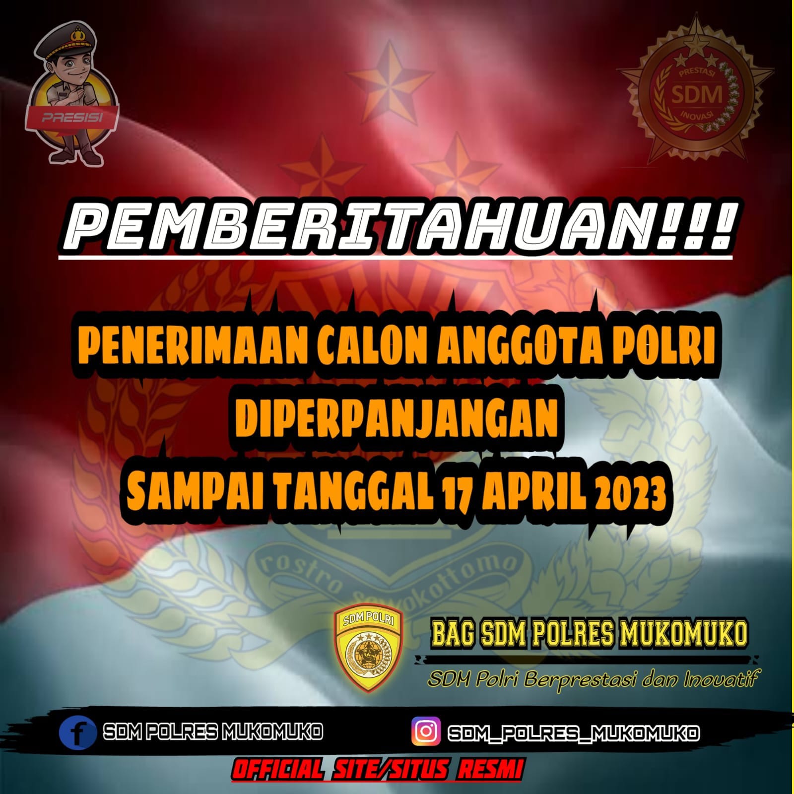 Kapolres Mukomuko Polda Bengkulu AKBP Nuswanto, S. H, S. I. K.,M.H melalui Kabag SDM Akp Syafrizal menginformasikan,”pendaftaran masuk Polri yang seyogyanya tutup pada tanggal 14 April, diperpanjang hingga tanggal 17 April 2023. Bagi para generasi muda yang berminat menjadi Polri, dapat segeera menyiapkan berkas persyaratan yang dibutuhkan dan melakukan pendaftaran dari sekarang sebelum waktu pendataran ditutup”.