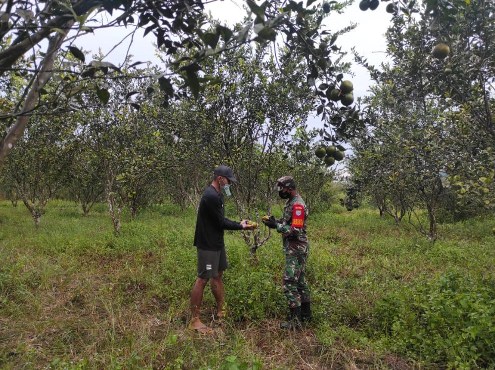 Babinsa Koramil 1014-05/P.Banteng Serda Muheini Kodim 1014/Pangkalan Bun melaksanakan peninjauan Tanaman Buah Jeruk yang akan di panen milik Bapak Marsani anggota Pok Tani Desa Natai Kerbau Kecamatan Pangkalan Banteng, Kabupaten Kotawaringin Barat.