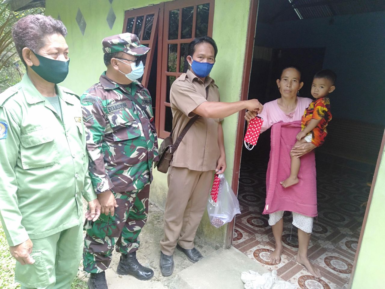 Landak – Babinsa Koramil 1201-08/Mandor, Serda Syamsuddin bersama perangkat Desa Kerohok membagikan masker secara gratis kepada warga Desa Kerohok Kecamatan Mandor Kabupaten Landak, Kamis (10/6/2021).