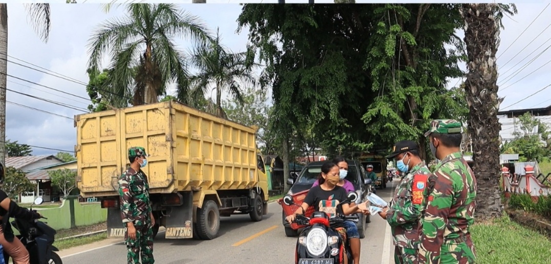 Landak – Untuk membantu Pemerintah dalam menekan penyebaran Covid-19, Danramil beserta Anggota Koramil 1201-11/Ngabang, jajaran Kodim 1201/Mph, melaksanakan Operasi Yustisi dan Penerapan Pembatasan Kegiatan Masyarakat (PPKM) di Depan Makoramil, Jalan Raya Pemuda, Dusun Tungkul, Desa Hilir Kantor, Kecamatan Ngabang, Kabupaten Landak, Jumat (11/6/2021). Operasi tersebut dibarengi dengan pembagian masker gratis kepada pengguna jalan.