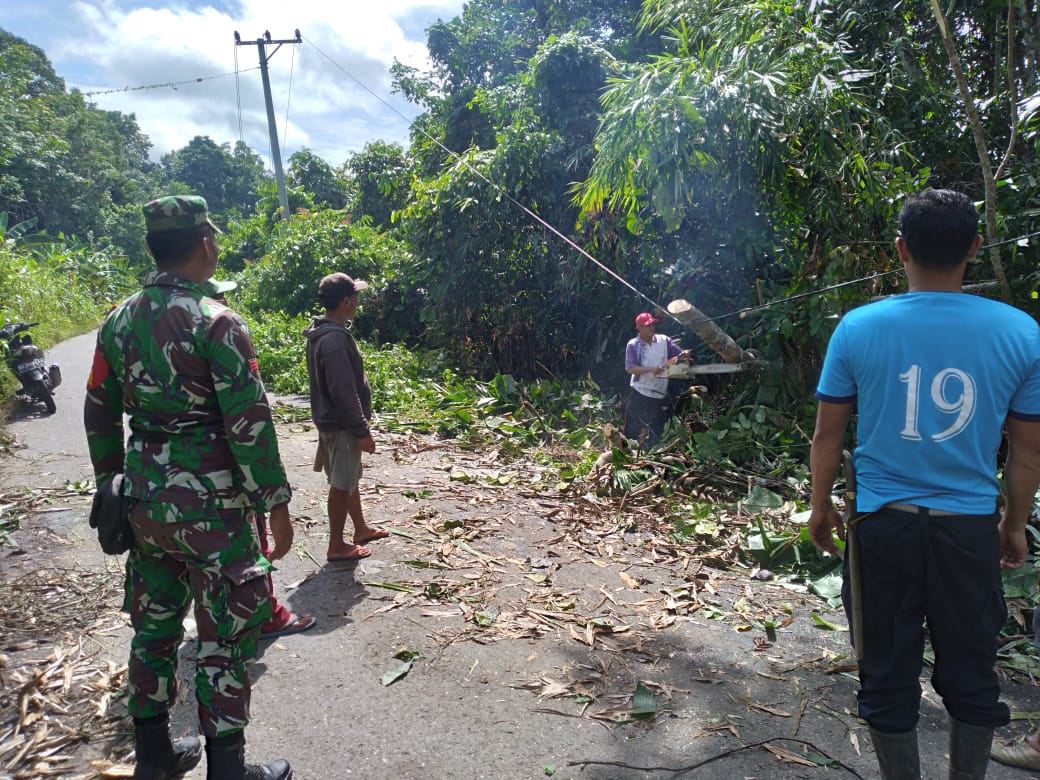 BARITO UTARA – Babinsa Koramil 1013-02/Montallat Jajaran Kodim 1013/Mtw Praka Roni melaksanakan gotong-royong bersama masyarakat membersihkan pohon dan rumput liar di pinggir badan jalan Desa Pepas Kecamatan Montallat Kabupaten Barito Utara, Pada hari Sabtu (12/06/21).