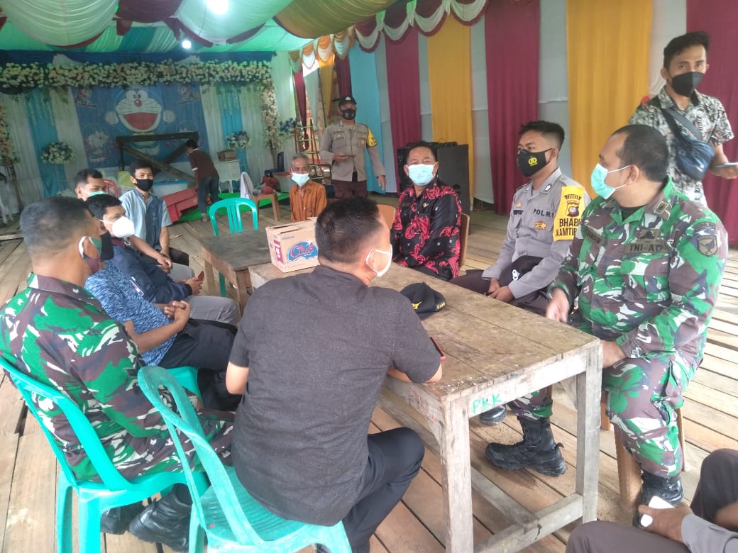 Landak – Danramil Air Besar, Peltu Lontas Bangun dan Satgas Covid-19 melaksanakan pemantauan penerapan protokol kesehatan pada resepsi pernikahan warga Desa Serimbu Kecamatan Air Besar, Kabupaten Landak, Jumat (11/6/2021).